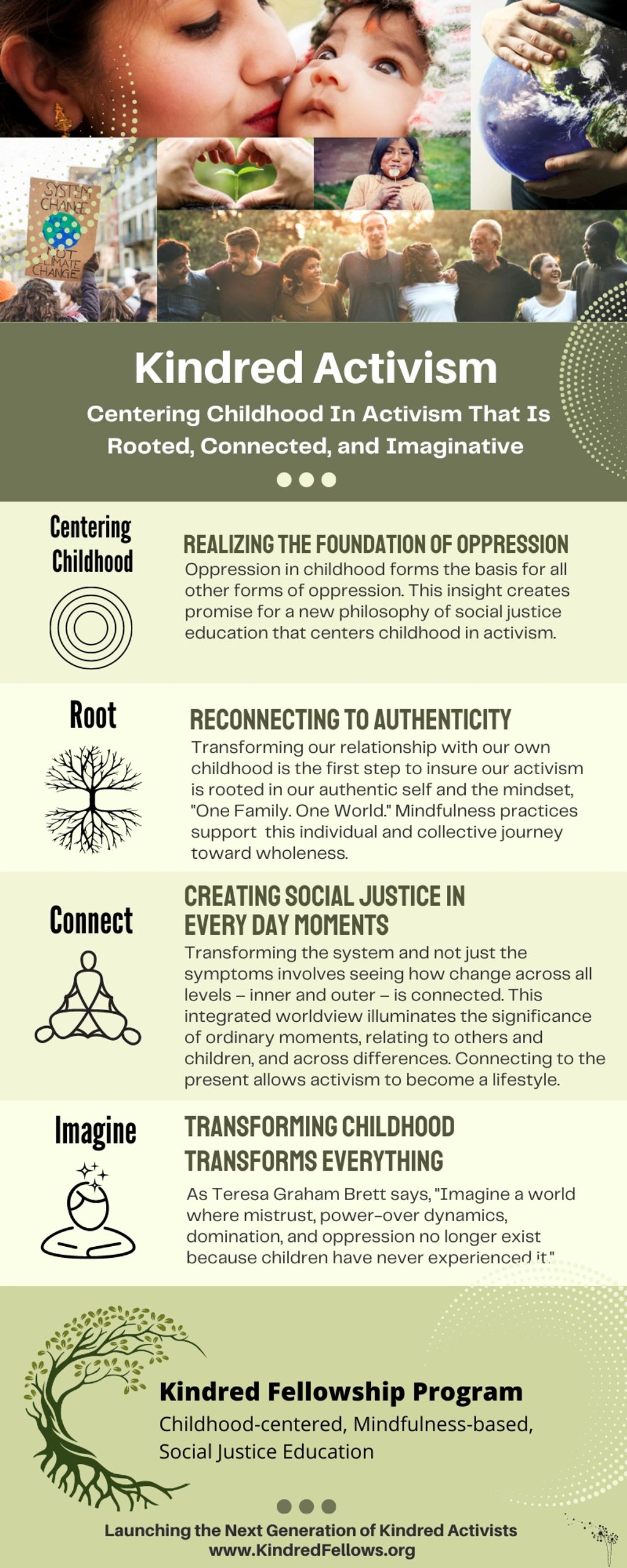 The KFP pilot project launched in 2021 to wide acclaim and celebration from both college students and thought-leaders. The program introduces a new generation to Kindred World’s quarter century of insights into Creating Sustainable Humans and a Wellness-Informed Society. Fellows work with staff and presenters to explore and refine Kindred Activism, a sustainable strategy for change-making that centers childhood in social justice education while equipping advocates with inner (mindfulness) and external (relational) skills.